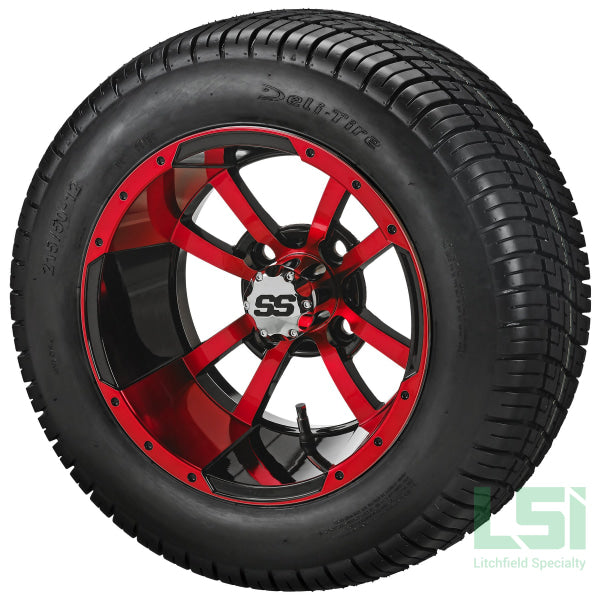 12x7 Black & Red Casino Wheel 3+4 Offset 4 on 4 Bolt Pattern SS Center Cap included 215/50-12 4ply Deli Tire May require lift. WARNING: Cancer & Reproductive Harm -...