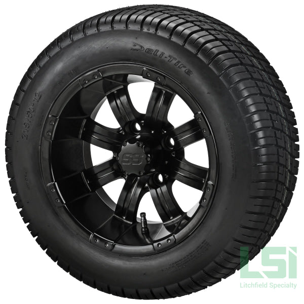 12x7 Black & Machined Tombstone Wheel 3+4 Offset 4 on 4 Bolt Pattern SS Center Cap included 215/50-12 4ply LSI Elite Tire May require lift. WARNING: Cancer & Reproductive Harm...